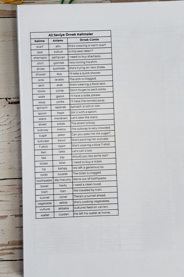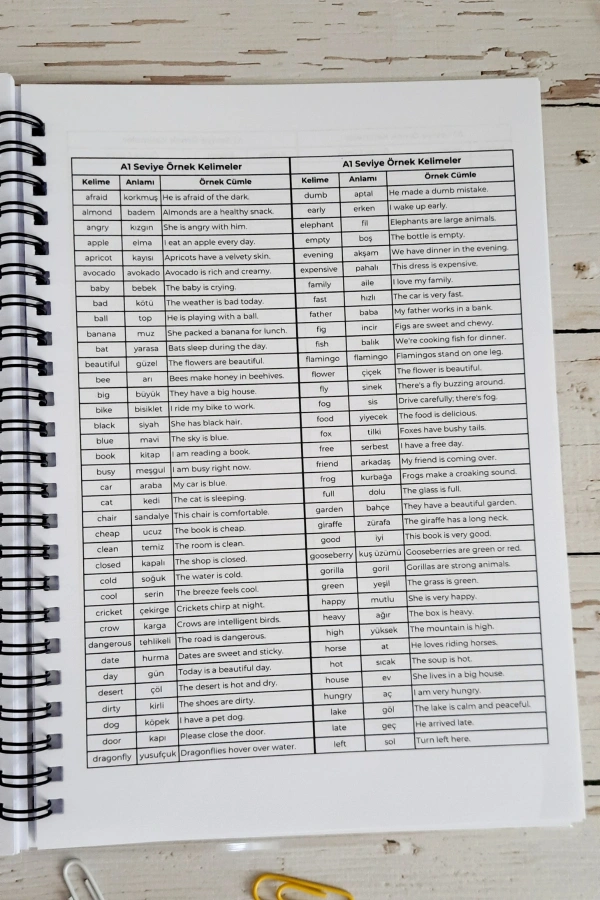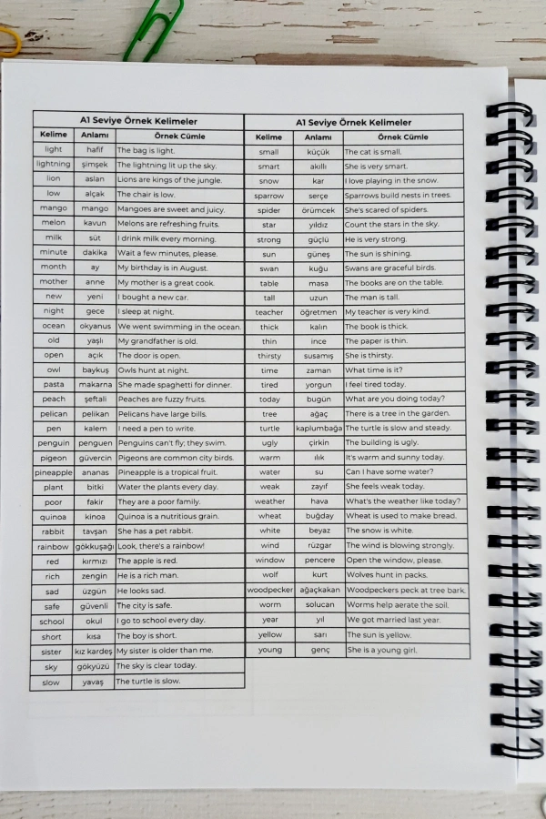 - A1 ve A2 seviyelerinde 250 örnek kelime ve Türkçe karşılıkları