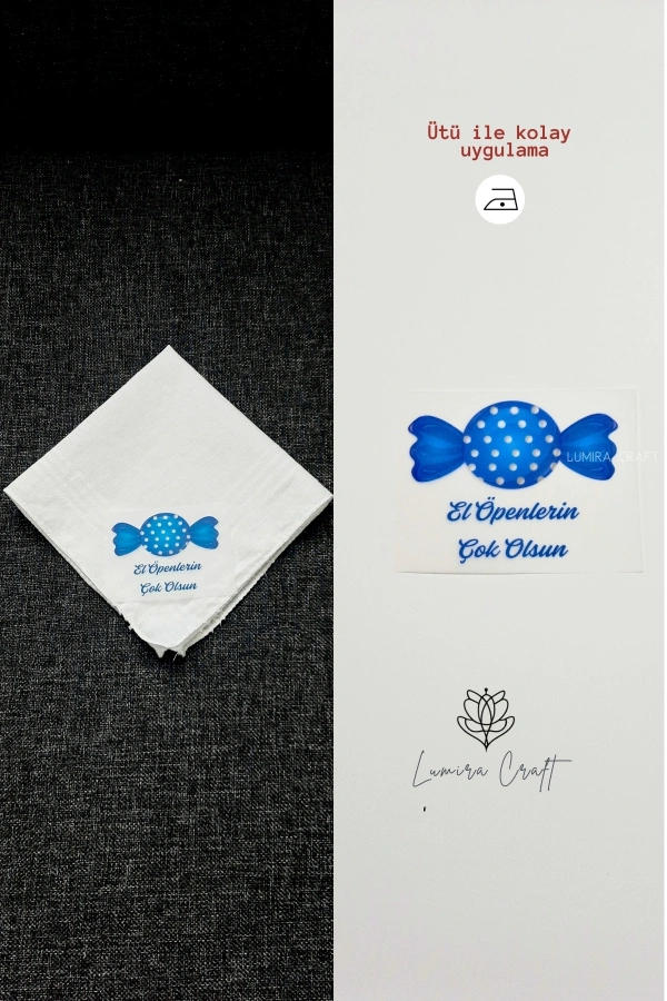 Mavi Şeker Mendil ve Kese Baskı Kağıdı, Kumaşa Ütü ile Yapışan DTF Transfer, Ramazan Bayramı