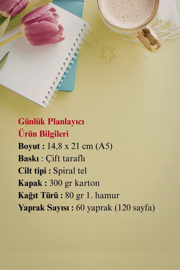 - A5 boyutunda pratik ve taşınabilir günlük planlayıcı.