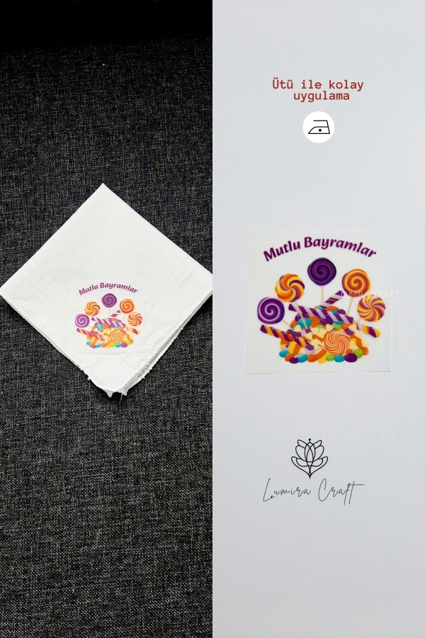 Mutlu Bayramlar Mendil ve Kese Baskı Kağıdı, Kumaşa Ütü ile Yapışan DTF Transfer, Ramazan Bayramı