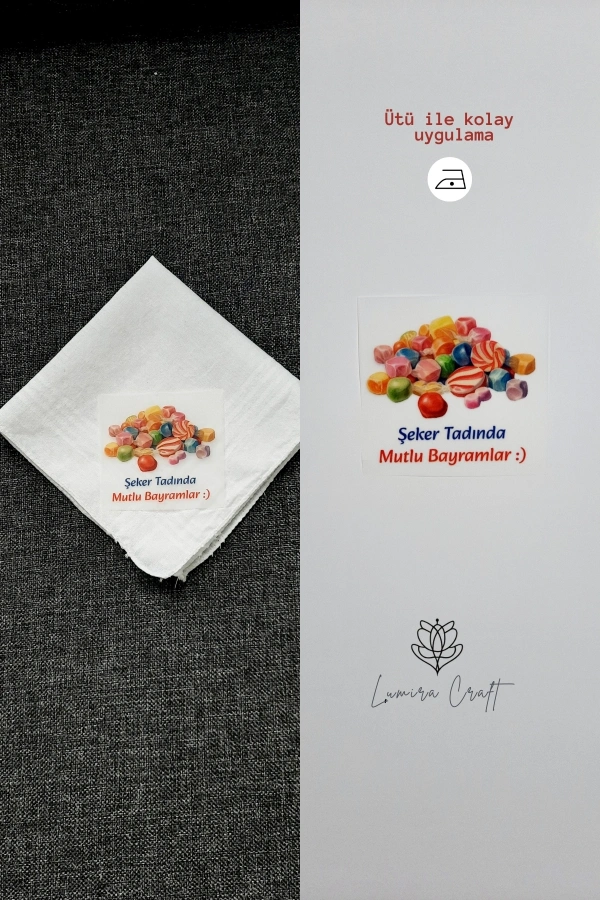 Şeker Tasarımlı Mendil ve Kese Baskı Kağıdı, Kumaşa Ütü ile Yapışan DTF Transfer, Ramazan Bayramı