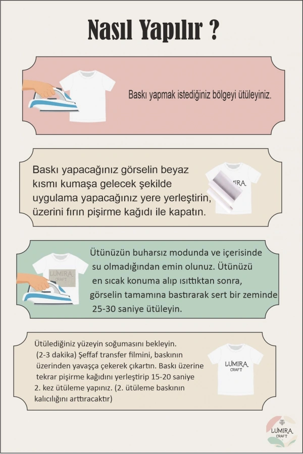 Arka kısmında beyaz baskı olduğu için koyu renk ürünlerde renk kaybı olmadan sonuç alınabilir.