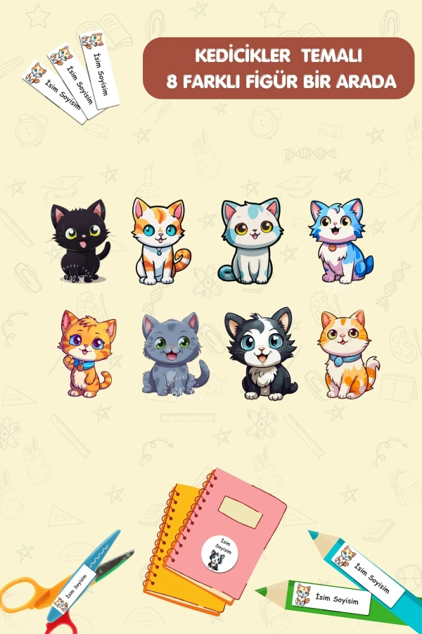 Sevimli Kedicikler Temalı İsme Özel 186 Adet Defter-Kalem-Kitap Etiketi