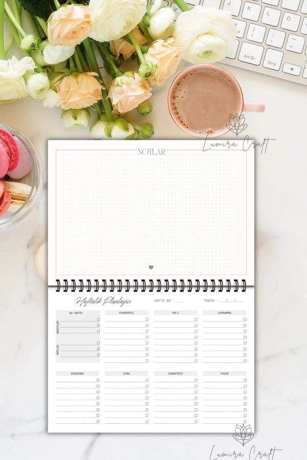 - A5 boyutunda pratik ve taşınabilir haftalık planlayıcı.