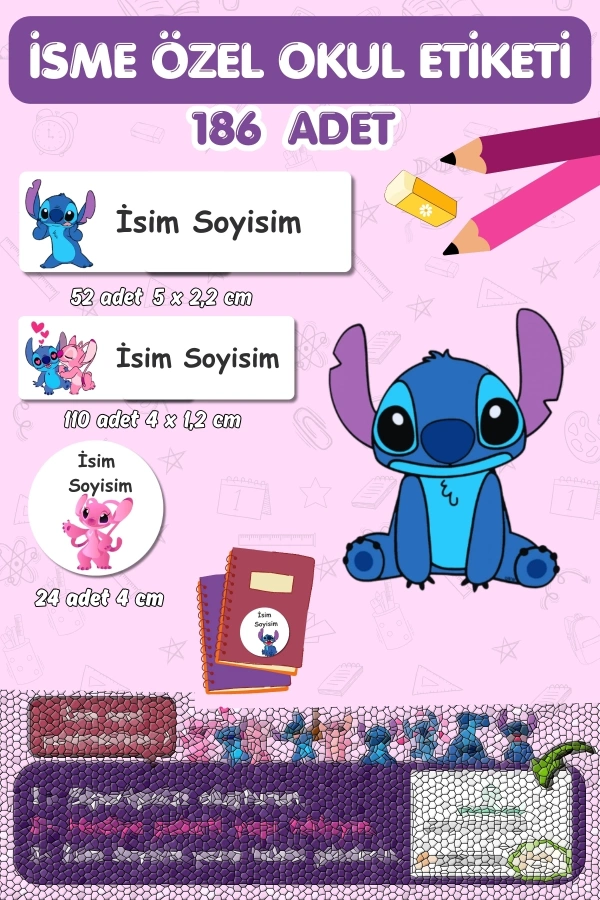 Aloha! ? En sevimli uzaylı Stitch temalı, 186 adet isme özel etiket seti ile okul eşyalarınıza muzip bir hava katın. Defterden kaleme, tüm eşyaları kişiye özel isim baskılı etiketlerle işaretleyin. Bu büyük set ile eşya kaybetme derdine son verin! Okula neşeli bir başlangıç yapın!
