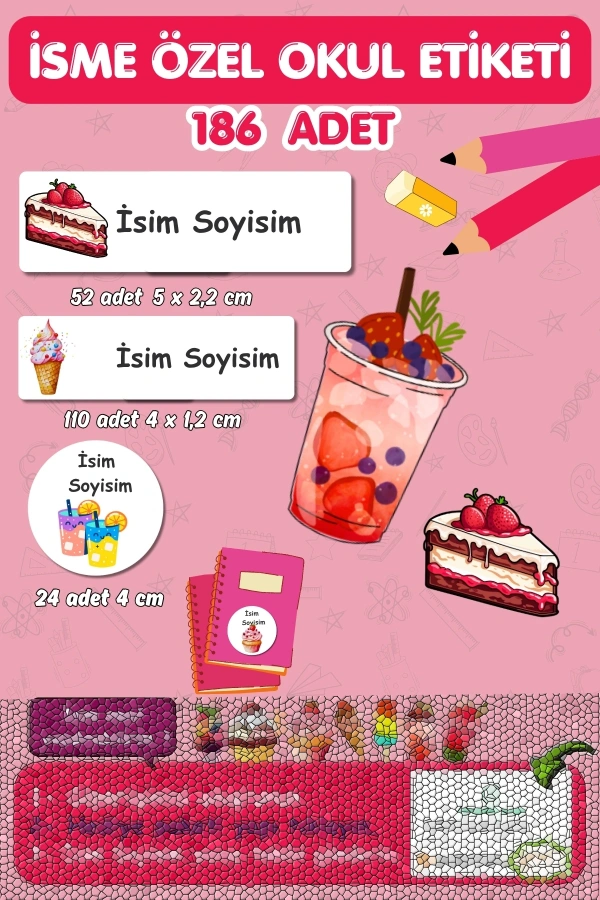 • Okula Lezzetli Bir Mola! ? Yaz Meyveleri, Dondurma ve İçecekler temalı, 186 adet isme özel etiket seti ile ders aralarına neşe katın. Çilek, pasta ve dondurma figürleriyle dolu bu büyük set sayesinde tüm eşyalarınız kişiselleşir ve kaybolmaz. Okul çantasını en tatlı figürlerle doldurun!