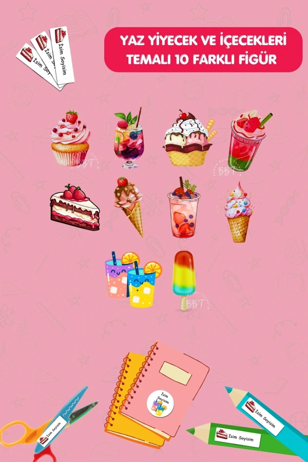 Yaz Meyve Pasta Dondurma İçecekler Temalı İsme Özel 186 Adet Defter-Kalem-Kitap Etiketi